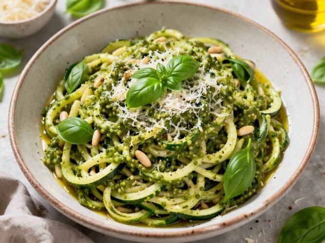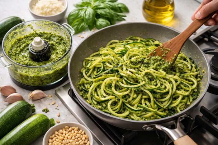 Zucchini is turned into thin, noodle-like strands. They are soft but slightly crisp. Then they are mixed with fresh pesto, which brings in all the flavor—basil, garlic, olive oil, that rich green goodness.